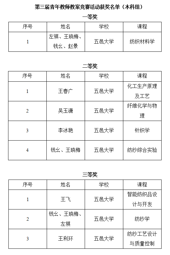 近日,由中国纺织服装教育学会主办的第三届青年教师教案竞赛活动顺利落下帷幕。本次竞赛吸引了全国各地纺织类专业青年教师踊跃参与,共收到200余份高质量参赛教案。经过激烈角逐,纺织科学与工程学院教师凭借扎实的教学功底和出色的专业素养,在比赛中脱颖而出,荣获多项殊荣。其中本科组一等奖1项,二等奖4项,三等奖3项。