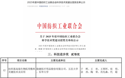 近日,五邑大学纺织科学与工程学院于晖教授团队联合稳健医疗用品股份有限公司、东华大学申报的“纺织基高端生物医用敷料关键技术及应用”获得2025年度中国纺织工业联合会科技进步二等奖,五邑大学申报团队包括于晖教授、王利环博士、余西博士。