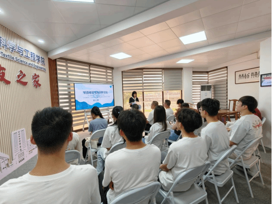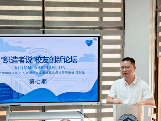 9月17日,纺织科学与工程学院第七期“织造者说”校友创新论坛在“校友之家”举行。本期活动邀请学院1998届校友、广东省揭阳市质量计量监督检测所所长江创生担任主讲嘉宾。学院党委书记黄应忠、副书记何婉平、辅导员以及2026届毕业生代表参加活动。