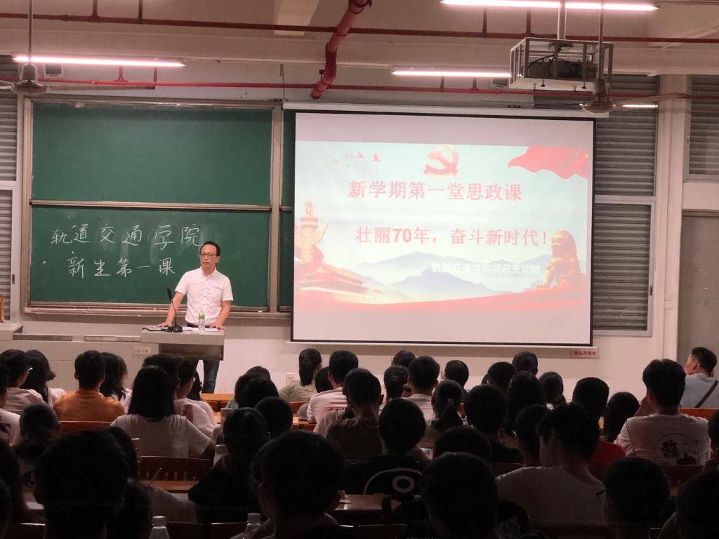 9月16日,轨道交通学院党总支书记邓铭在北主楼202,为2019级新生们讲授了题为“壮丽70年,奋斗新时代!”的开学第一堂思政课。