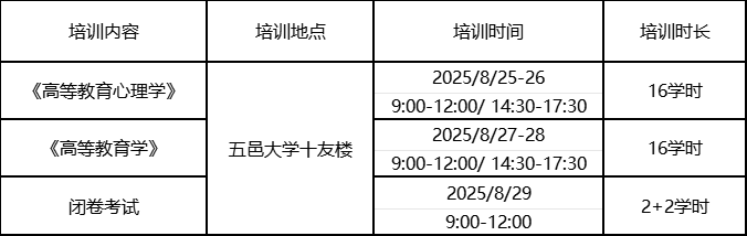3.培训教材。岗前培训使用教材为:《高等教育新论》(卢晓中主编,高等教育出版社,2016.10)、《高等教育心理学》(张积家主编,高等教育出版社,2016.10), 培训教材自行购买。