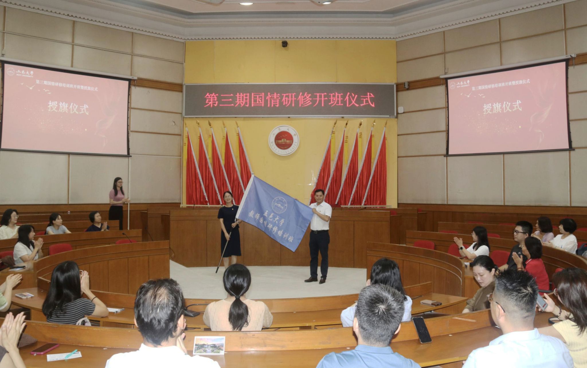 7月19日上午,学校举行第三期国情研修班开班暨授旗仪式。校党委副书记李华出席仪式并作动员讲话,党委组织部、党委教师工作部、马克思主义学院主要负责人、本期研修班学员等参加了仪式。