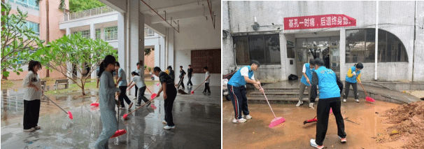 10月5日,受台风“麦德姆”影响,校园出现持续降水,部分低洼区域、绿化带边缘及走廊形成不同程度积水,成为蚊虫孳生的潜在隐患。学院第一时间响应学校防汛防蚊协同防控号召,迅速调整当日工作重点,由领导班子成员带队,组织师生志愿者携带水桶、扫帚、簸箕等工具,对积水区域开展集中清理。经过近 3 小时的奋战,学院包干区域内的积水全部清理完毕,有效阻断了台风后蚊媒滋生的可能,切实守护了校园防控安全。