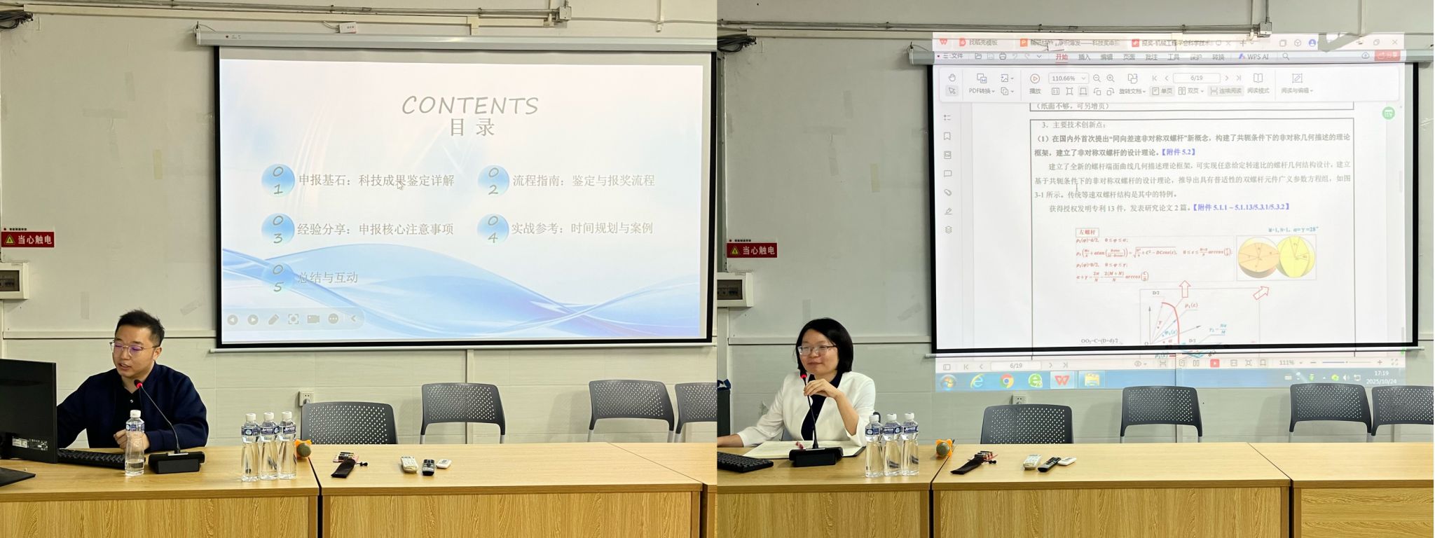 分享会上, 谈灵操老师首先围绕科技成果鉴定这一科研报奖的核心环节展开讲解, 系统梳理了成果鉴定的全流程,深入解析了各环节操作要点与注意事项,帮助与会教师准确把握关键节点 。随后,他重点介绍了申报材料的撰写方法,提出应构建逻辑严密、层次清晰的材料框架。最后,他总结了科技奖励申报的经验,建议各科研团队“早规划、重鉴定、精材料、强团队、懂规则”。