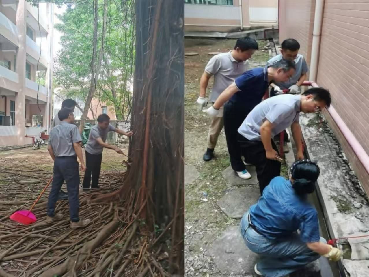 当日下午,专项攻坚行动全面铺开。学校陈文华校长亲临现场指导基孔肯雅热防控工作,深入各重点区域查看积水清除、杂物清运成效,仔细检查五友楼沟渠疏通后的排水流速,对排查中发现的潜在隐患逐一提出针对性整改要求,为行动开展注入强劲动力。