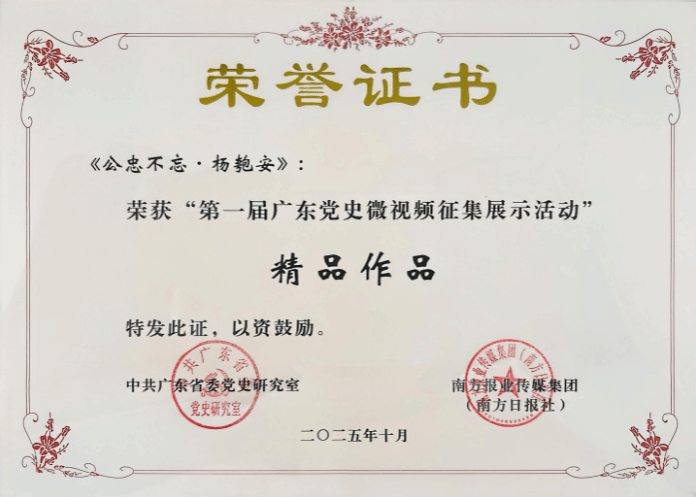 近日,由中共广东省委党史研究室与南方日报、南方+客户端联合举办的“第一届广东党史微视频征集展示活动”评选结果产生。该活动向全社会征集高质量的党史融媒体作品707个,经专家组共同评选,最终确定精品作品、优秀作品、人气作品共100个(其中,精品作品20个)。我院研究生党支部书记王露露老师团队的微视频作品《公忠不忘·杨匏安》获评“第一届广东党史微视频征集展示活动”精品作品。