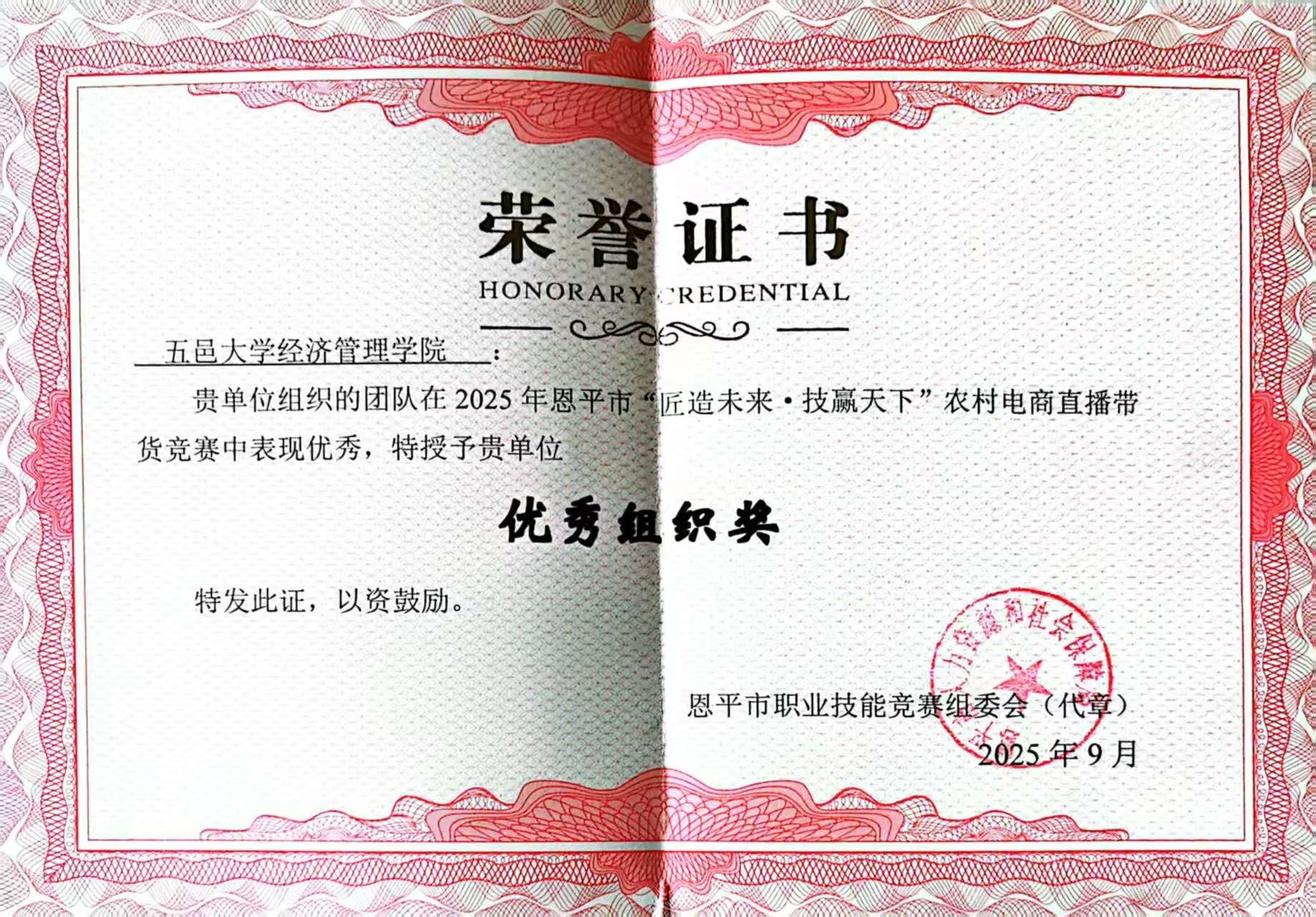 参赛的两支团队每日根据主办方公布的直播数据排名,仔细复盘,分析不足,不断优化直播风格与话术,经过历时10天的激烈角逐和现场直播的巅峰对决,两支团队最终分获二等奖和优胜奖,展现了邑大学子的风采,边云岗、苏芳芳、叶艺勇、王思等老师荣获优秀指导奖,五邑大学经济管理学院荣获优秀组织奖。