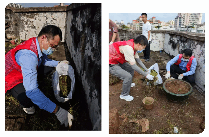 9月27日,肖天柳、阳明凤、尚小华、陈辉、国吉五位教工党员深入双龙社区老旧楼栋,针对楼顶、阳台等高空区域堆积的各类积水容器展开重点清理。他们逐栋排查,肩扛手拎,将居民废弃的盆罐、水桶等蚊虫孳生源彻底搬离,从源头清除病媒孳生环境,切实降低了社区蚊媒传播风险。
