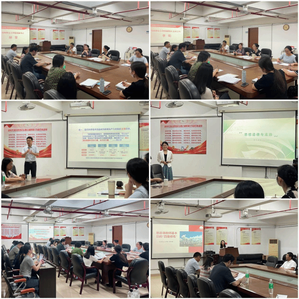 新入职教师卢勇、高源分别以《科学技术是第一生产力》《做新时代的忠诚爱国者》为题进行试讲,卢勇老师深入浅出地讲解了“科学技术是第一生产力”这一论断提出的社会历史条件与形成过程;高源老师从三个维度阐明了为什么新时代的爱国者要坚持爱国和爱党、爱社会主义相统一。青年教师罗林青以《思政课教师基本功的“四重修炼”》为题,分享自己获教学比赛省级奖项的备赛经验与心得体会。在场老师积极发表个人想法,王子旋老师对两位新教师的加入表示热烈欢迎;张淑妹老师认为两位老师的讲课风格各具特色;魏宗鹏老师就卢勇老师试讲中涉及的生产力相关概念与老师们进行讨论。