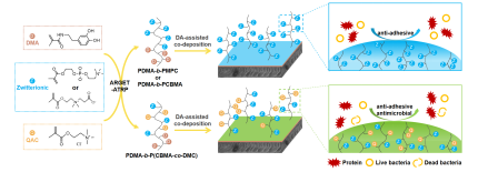 谢高艺副教授研究团队曾在多巴胺的辅助作用下将含邻苯二酚集团的单体和亲水性两性离子单体聚合得到的无规共聚物结合到了膜表面,研究表明改性膜的亲水性得到了改善,不仅显著提高膜的抗污染性能,还解决传统膜的“trade-off”效应(COLLOID SURFACE A, 2023, 656: 130505)。然而,在该研究的过程中也发现所制备的无规共聚物存在水溶性不佳的缺陷,为解决此问题,研究团队利用ARGET-ATRP聚合技术将邻苯二酚基团、两性离子和/或阳离子基团结合到同一个高分子中,制备得到了多种水溶性良好的嵌段共聚物,并通过多巴胺辅助沉积策略制备得到了多种亲水改性膜,展现了优异的抗污染性能。其中,PDA/p(DCD)-1-PVDF改性膜展现出卓越最佳的性能:高分离效率(纯水通量为187.4 L·m-2·h-1,牛血清白蛋白截留率达97.17%)、优异的抗污染性(FDR值为9.57%,FRRt,corr值为84.78%)和极强的灭菌性能(对大肠杆菌和金黄色葡萄球菌灭活率均达到100%)。本研究证实了“两性离子-阳离子”结构在提升超滤膜抗蛋白黏附和灭菌性能方面的应用潜力。