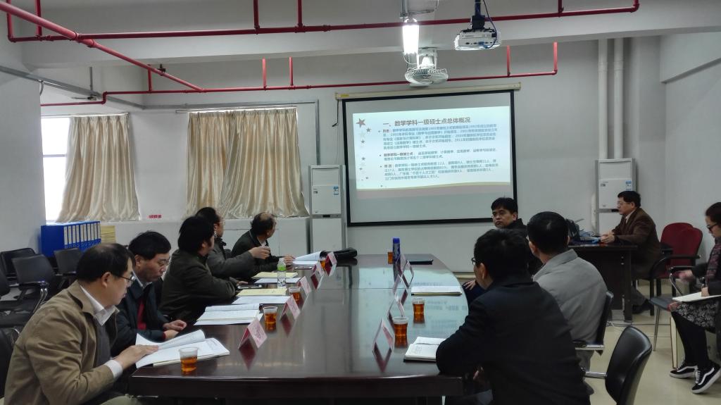 12月19日,数学学科一级硕士学位授权点合格评估同行专家评审会在北主楼1207会议室召开。此次会议的评估专家团成员包括来自中山大学数学与计算科学学院院长姚正安教授、中山大学数学与计算科学学院冯国灿教授、华南理工大学数学科学学院院长朱长江教授、华南师范大学数学科学学院院长丁时进教授、广东工业大学应用数学学院院长金朝永教授。数学与计算科学学院党总支书记吴焱生、院长谢祥云、副书记杨玉豪、副院长邹祥福等参加了本次评审会。
