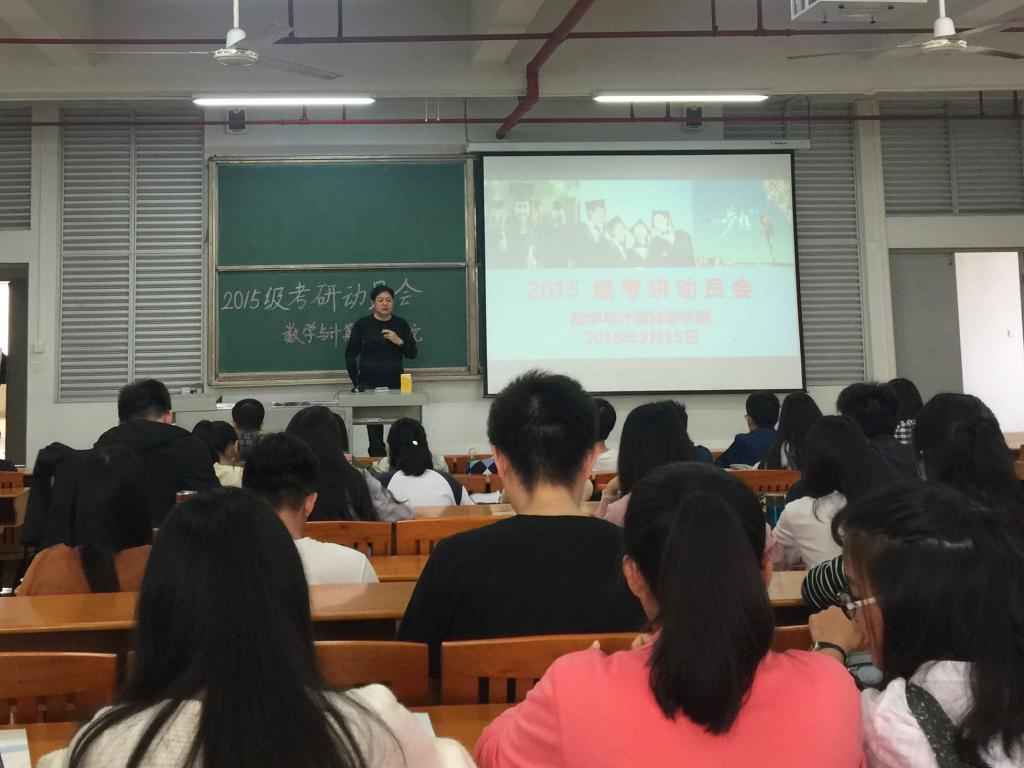 3月15日,数学与计算科学学院在北主楼1001召开2015级考研动员会。会议由学院党总支副书记杨玉豪主持,党总支书记吴焱生、院长谢祥云、副院长邹祥福、2015级班导师、辅导员及2015级学生参加了动员会。