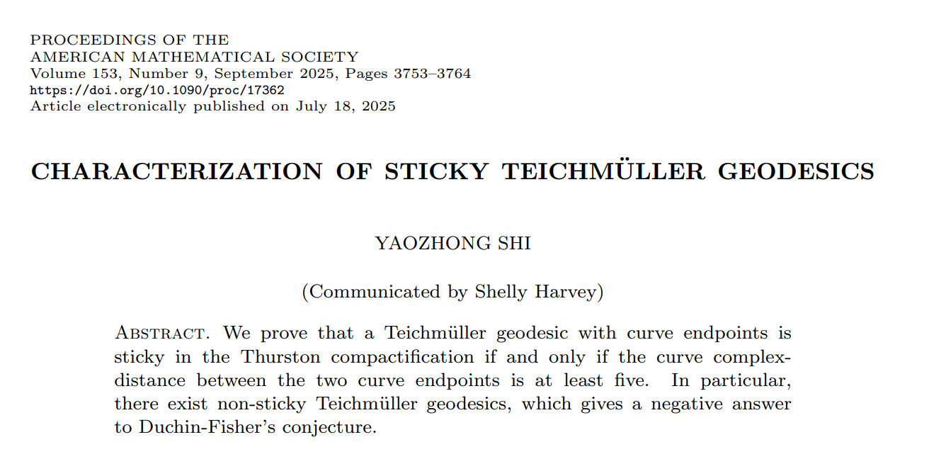 施耀忠博士以独立作者身份,于2025年9月在《Proceedings of the American Mathematical Society》 上发表题为《Characterization of sticky Teichmüller geodesic》的高水平论文,该期刊由美国数学会主办,创刊于1950年,是数学领域国际知名综合性期刊。文章主要研究了Teichmüller空间的粘性测地线的刻画,此成果反映了学院青年学者在复分析和几何拓扑方向上的研究取得新进展。
