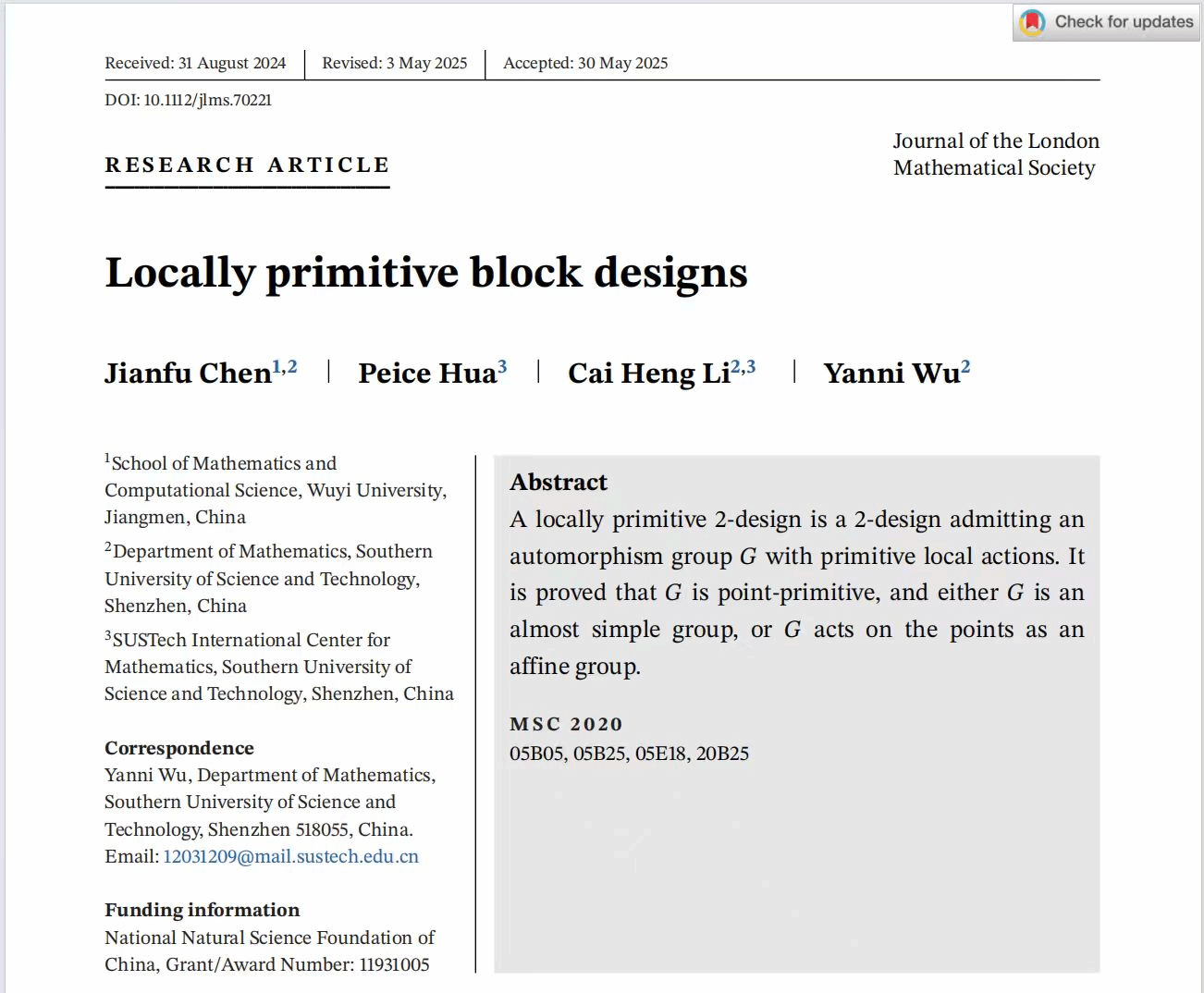 陈健夫博士与国内外同行合作,于2025年6月在数学领域一流国际学术期刊《Journal of the London Mathematical Society》上发表题为《Locally primitive block designs》的高水平研究论文。该期刊由英国伦敦数学会主办,创刊于1926年,是数学领域极富声誉且受到广泛关注的著名综合性期刊。文章主要研究了有限群的结构、作用与区组设计自同构群的相关问题,将区组设计的局部本原自同构群归约到仿射群和几乎单群,此成果体现了学院青年学者在群论与代数组合领域上做出的新贡献。