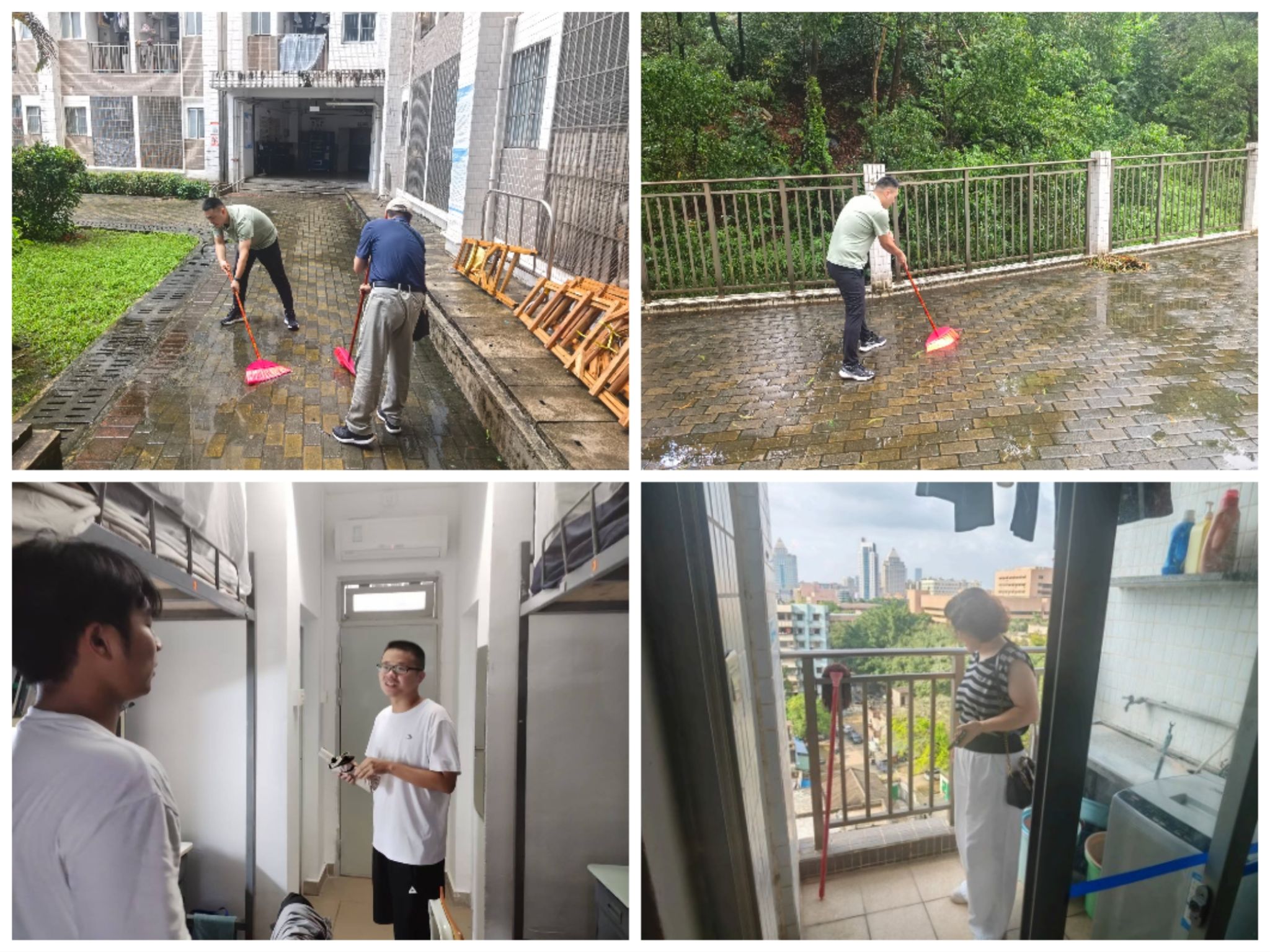 9月25日,台风“桦加沙”过境后,学院第一时间号召各党支部积极发动党员带头,召集师生志愿者,组织培训,了解工作要求,随后投入到紧张的灾后环境清理工作中。清洁范围不仅覆盖学院办公区域和学生宿舍,更根据学校统一部署,承担起北主楼、黄浩川教学楼两栋楼宇的公共区域卫生整治任务。在学生宿舍区,辅导员与班导师积极投身其中,深入学生宿舍,耐心提醒学生注意日常清洁与消毒,示范如何有效清理积水和杂物,以防止蚊虫孳生。