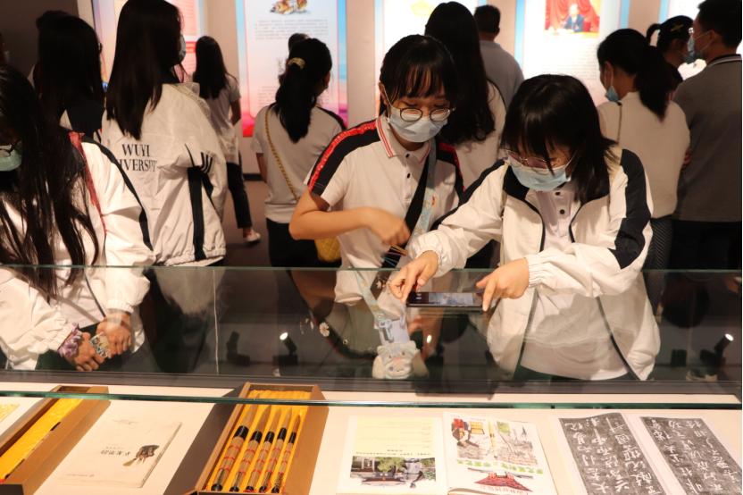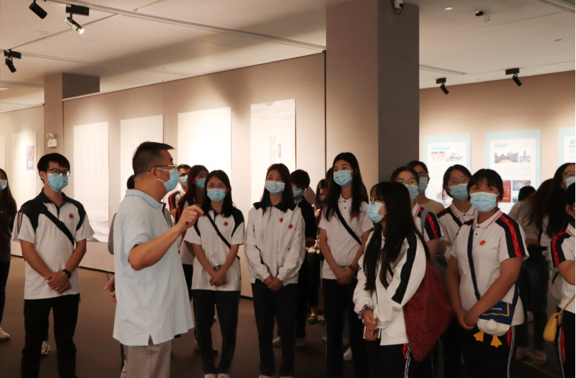 在讲解员的带领下进入江门市美术馆6号展厅,观看“清廉金融”主题文艺作品大赛的获奖作品,并了解展厅融入的新会葵扇、茅龙笔、梁启超著作等侨乡特色文化元素。学生们在《劳模.不朽》这幅摄影作品里找到了李霭康副书记在1997年被评为江门市劳动模范的足迹,李霭康副书记随即给学生们讲述奋斗的往事。紧接着,参展人员前往5号展厅,学习以“廉政警示”为主题的金融反腐警示案例和江门本土清廉故事,了解江门市杰出人物的优秀事迹,在参展过程中,李霭康副书记处处引导和启发学生们进行思考。