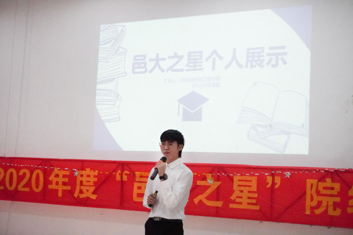 本次活动由陈德钦与周姣姣主持,学院中参与评选的邑大之星先进行演讲展示,再由评委老师与观众投票评选出院级的“邑大之星”。此次评选中,自强之星评选者李浩宇、谭敏锐展现了认真刻苦,积极面对生活的态度,以及自强不息的精神;其次服务之星评选者林海鹏、宁金桃、吴子杏展现了奉献自己帮助他人,只求付出不求回报的动人精神;随后学习之星评选者邓亚青、陈嘉琪与学术之星评选者白楚杭、李君喜向同学们分享了大学学习的技巧与方法,并提出了学习工作两兼顾的说法,从而不断的提升自己的各项综合素质;接着艺术之星评选者林宛君讲述了艺术能够感染他人,能够传递人们的感情;最后的体育之星评选者吕钧行讲述了体育之于生活的影响,体育锻炼能够强韧人们的心理,更蕴含着坚韧不拔的精神。此次决赛最终评选出了自强之星谭敏锐、服务之星林海鹏、学习之星陈嘉琪、学术之星李君喜、艺术之星林宛君与体育之星吕钧行。