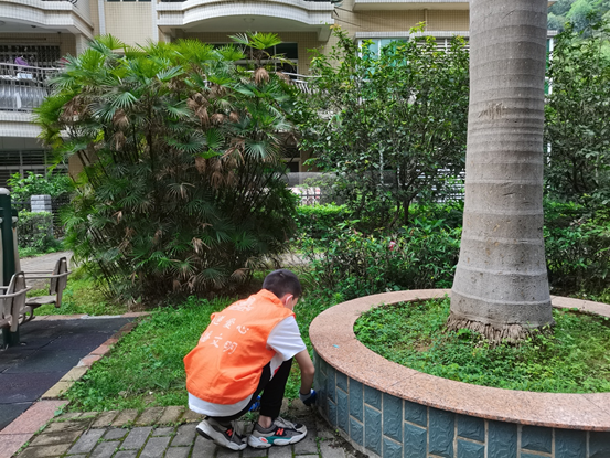 到达目的地后,志愿者在组织安排下对小区的绿化区域进行清理打扫,有的志愿者负责拔掉路砖缝里生长的杂草,有的志愿者负责用夹子夹出绿化带里的垃圾。志愿者的积极工作和与社区保洁人员的合作使得社区环境变得更加干净整洁。