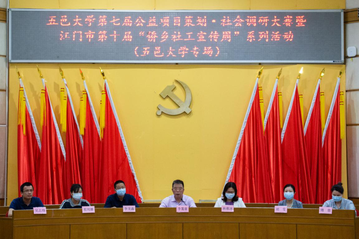 4月17日上午,五邑大学第七届公益项目策划·社会调研大赛暨江门市第十届“侨乡社工宣传周”系列活动(五邑大学专场)在五邑大学十友楼国际会议厅举行。校党委副书记李霭康、江门市民政局党组成员、副局长林雁冰,慈善事业和社会工作科科长李龙鑫、江门市社会工作协会秘书长李柳芬、政法学院党总支书记胡莹,院长程利娜,副院长傅蓉和社会工作专业教师和学生参加会议。会议由政法学院党总支副书记吴志锋主持。