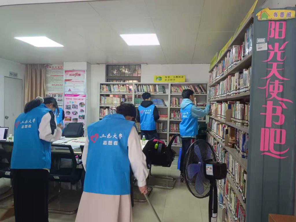 (志愿者们在认真整理图书和打扫卫生)