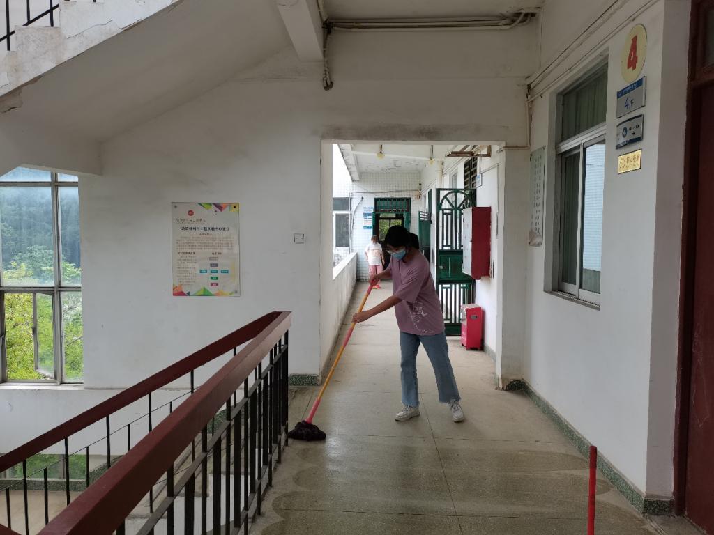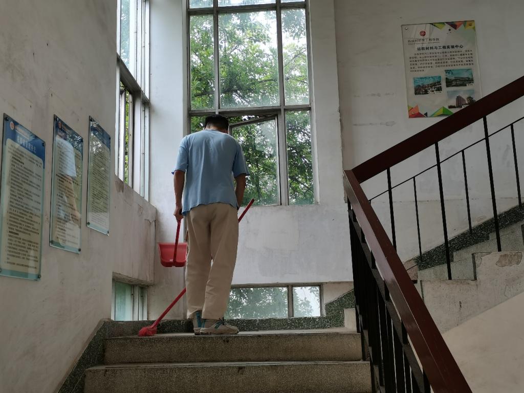 志愿者在打扫楼梯