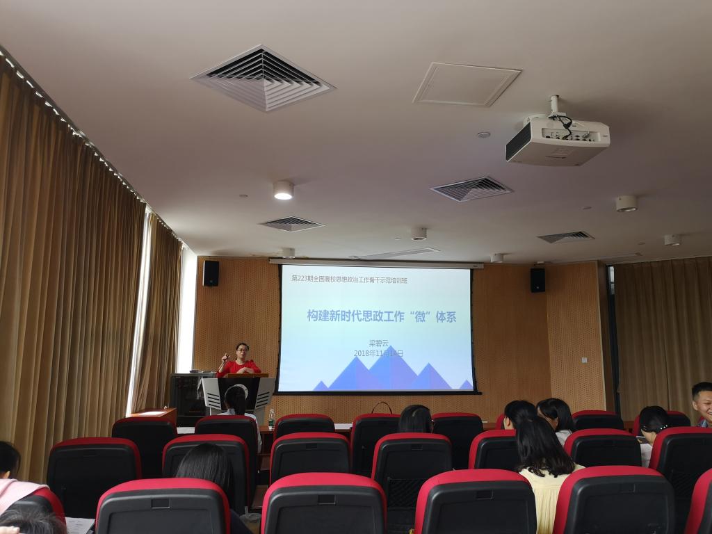 沙龙上,参加了培训的辅导员梁碧云、刘琪琛两位老师分享本次培训的收获。梁碧云以“构建新时代高校思政工作'微'体系”为主题,对第223期全国高校思想政治工作骨干示范培训班进行了分享,介绍了此次培训班的各场专题报告的主要内容,讲解了网络时代学生思想特点及如何开展网络思想政治教育,并重点分享了浙江大学与福建师范大学的网络新媒体时代思政工作创新做法践以及对我校工作实际的借鉴指导意义。政法学院刘琪琛就参加第227期全国高校思想政治工作骨干示范培训班分享了相关内容,包括大学生常见心理问题表现,如学习娱乐化、反智与反知、拜金与拜物、交往唯我化、自卑与自负、爱情游戏化等相关特点,指出其核心问题是以自我为中心,随后其重点介绍了当前高校突发网络危机事件的要素和特点及应对网络舆情与危机的具体做法。