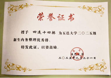 四连十四排由电子信息工程(应急装备与技术工程)专业251903 班、交通工程(防灾减灾科学与工程)专业251904 班组成,获评“新生内务整理优秀排”,以严谨细致的作风彰显了应急人才必备的自律素养。